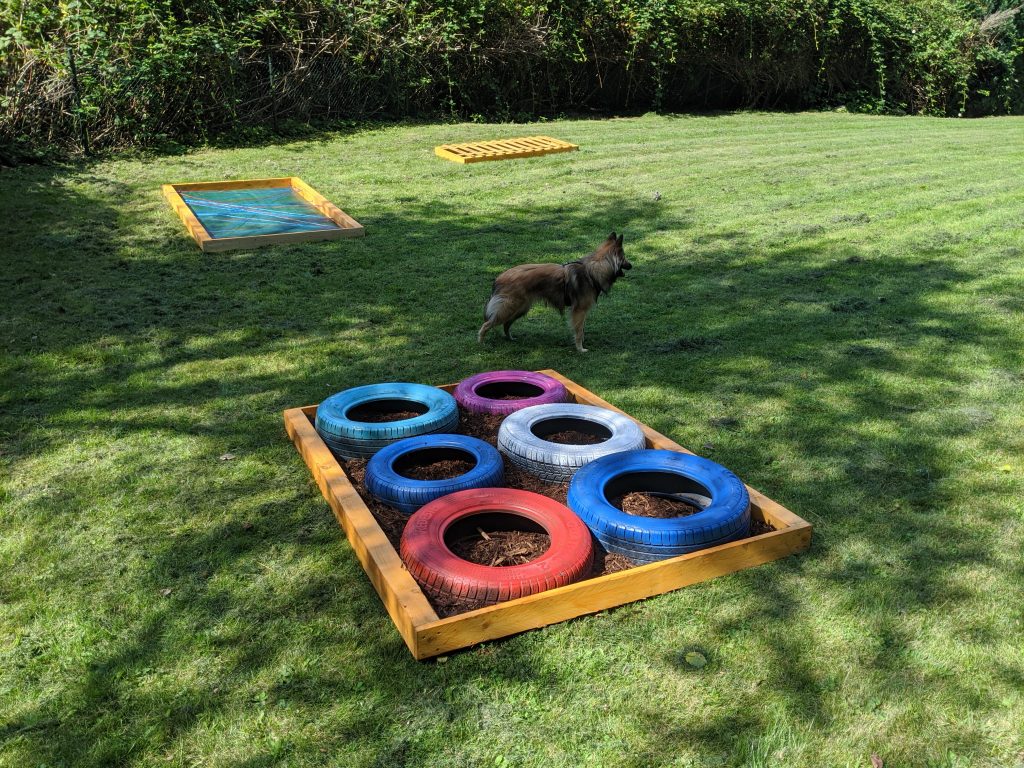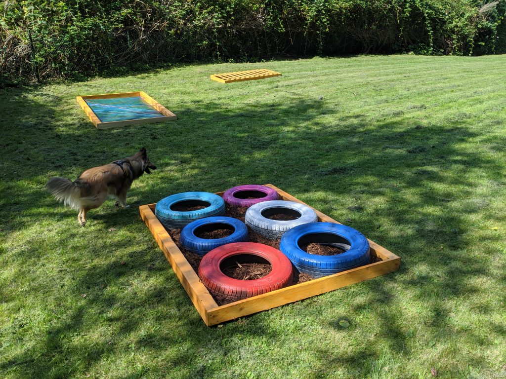 Als zweites eine doppelte Reifenreihe unterlegt mit Hackschnitzeln. Vorsichtiges Balancieren auf den nachgebenden Reifen und dem weichen Untergrund.